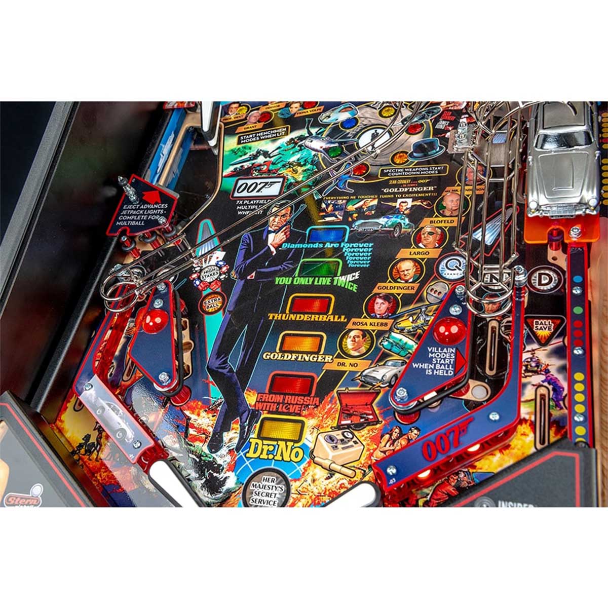 - Custom sculpted Aston Martin DB5 vertically ejects pinballs through the roof feeding a wireform ramp return
