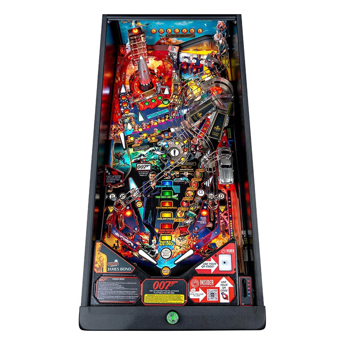 - Back panel illuminated S-P-E-C-T-R-E spell-out highlights progress toward Bird One Multiball Jackpot Value and lites SPECTRE Weapons feature